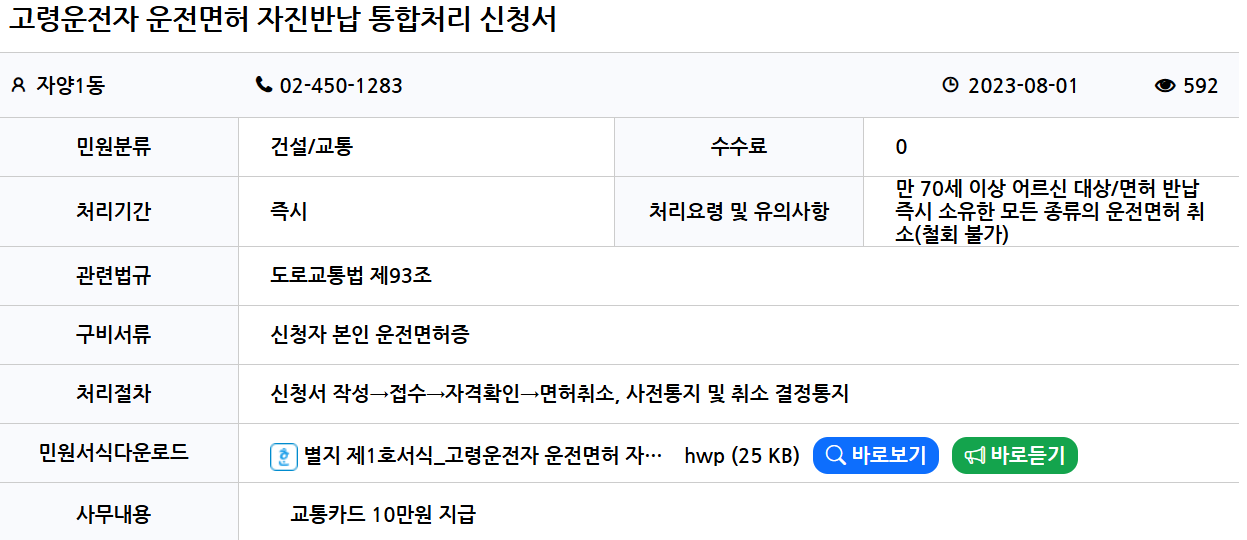 | 조건 | 주민등록지 기준 자진 면허 반납 및 실효 처리 |